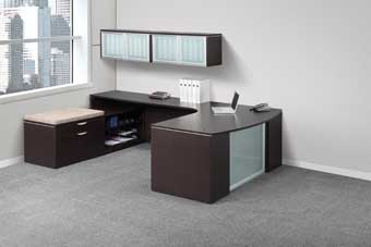 New Furniture – Classic Laminate Series Step-Front L-Shape Desk with Frosted Glass Modesty Panel (Espresso)