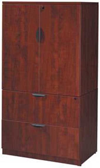 PL152 36w x 22d x 36h Double-Door Storage Cabinet (Cherry) on top of PL112 36w x 22d x 29h Laminate Series 2-Drawer Lateral File (Cherry)