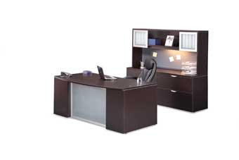New Furniture – Wood Veneer Series Bow Front Freestanding Desk with Frosted Modesty Panel and Credenza with Hutch (Espresso)