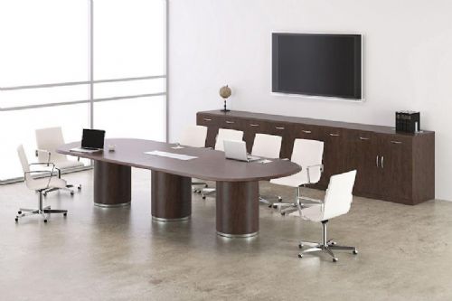 New Furniture - Deskmakers 12ft Racetrack Conference Table with Full Cylinder Bases (Tuscan Walnut) Please call 818.763.3470
